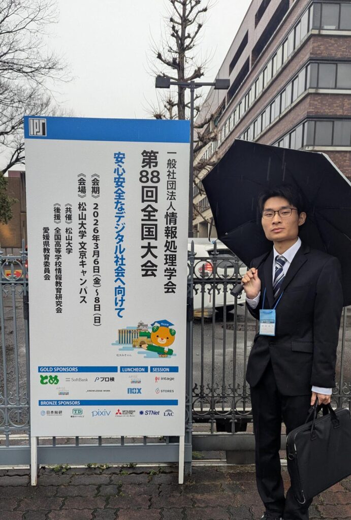 本校専攻科電子情報システム工学専攻1年の大﨑翔太君(情報工学科出身)が,3月6~8日に松山大学(愛媛県松山市)で行われた情報処理学会第88回全国大会にて研究発表を行い,学生奨励賞を受賞しました.発表タイトルは「Node-RED フローから mruby/c へのトランスコンパイラの開発・検証」です.島根県の島根ソフト研究開発センター (ITOC) を中心に開発の進む軽量 Ruby 言語 (mruby/c) を活用し,フロー型ビジュアルプログラミングツール Node-RED で作成されたプログラムをマイコン上で直接実行可能にするための仕組みを考案・実装し,高い評価を得ました.