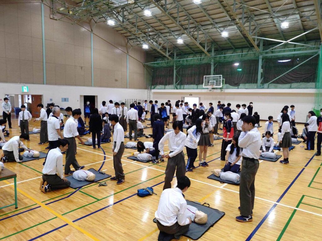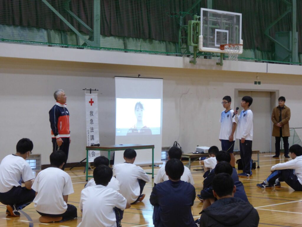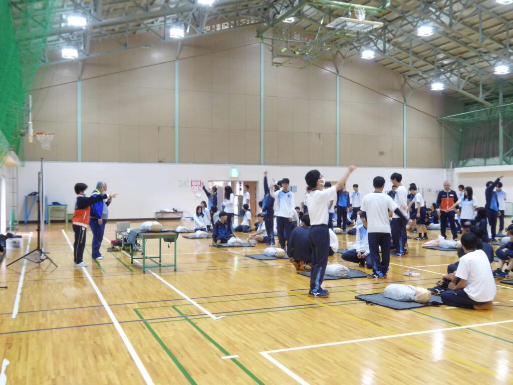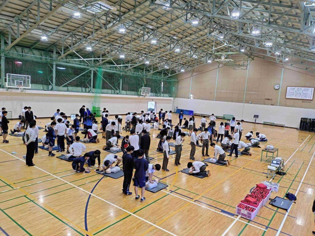 11月5日(水)及び10日(月)に本校にて、日本赤十字社島根県支部より講師を迎えて救急法(胸骨圧迫・人工呼吸・AED等)を実施しました。近年は「心臓マッサージ」と言わず、「胸骨圧迫」と言うこと、AEDは進化しているが、テープを貼ることのみは人間がしなければならないので隙間なく慎重に貼らなければならないこと、また、人工呼吸は強く吹き込むと胃の中の物が逆流して窒息する恐れがあるのでやさしく吹き込むこと等を学びました。